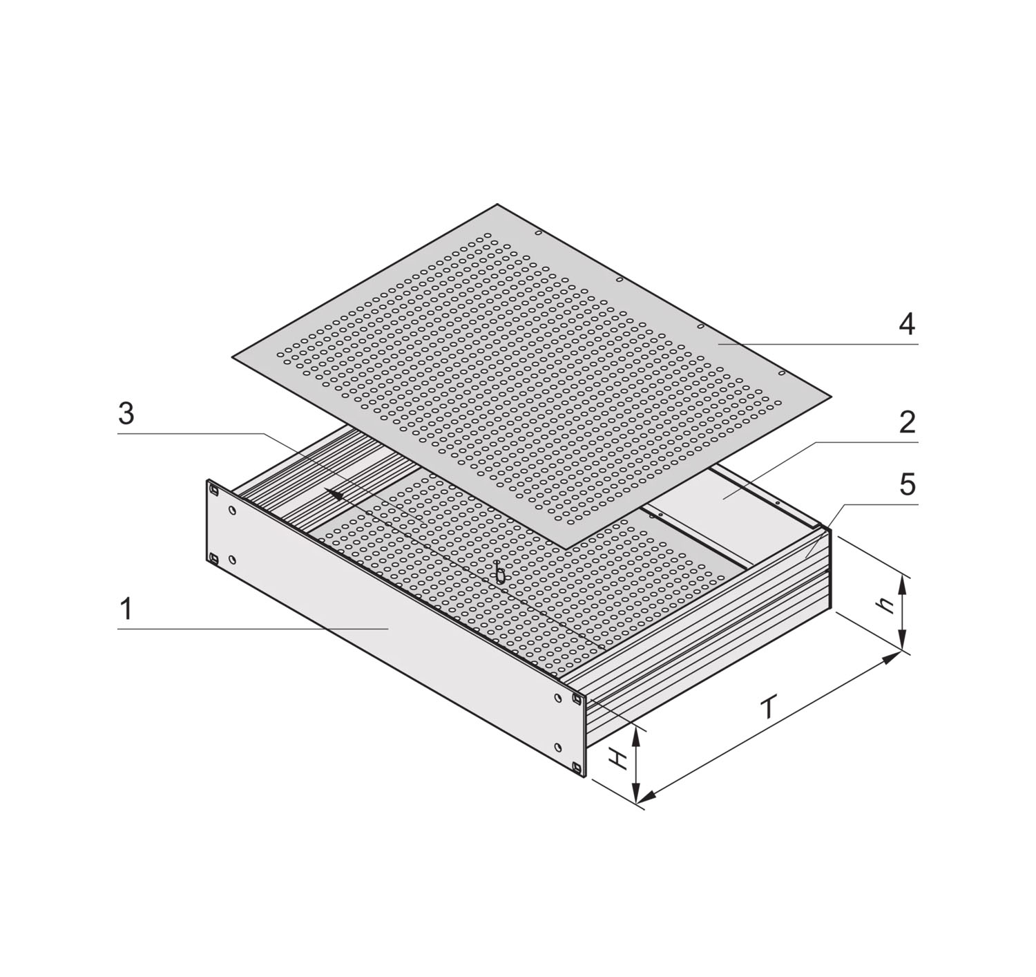 Cover and base plate drilled with holes for horizontal mounting of euroboards